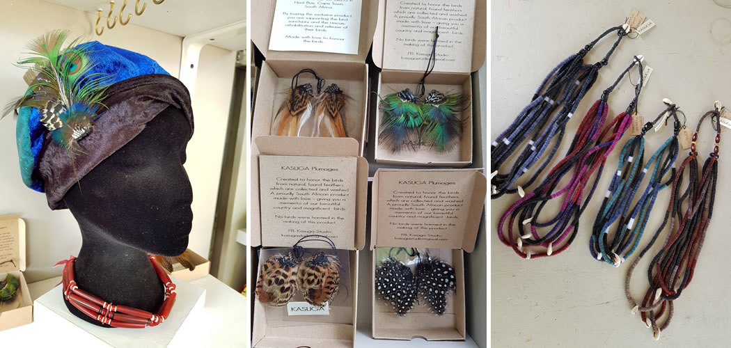I work with feathers and beads and also make hats. The feather work is my absolute passion. I collect feathers at The Chapmans Peak Caravan Park and at World of Birds in Hout Bay, so I get exotic feathers like parrot, scarlet ibis, flamingo, cape eagle owl. They are all collected feathers, found when the birds are moulting. I sort, clip and wash them then freeze them for 72 hours to sterilise the feathers. Then I start creating. It’s about using something that is of itself incredibly beautiful, to create something else new and beautiful.