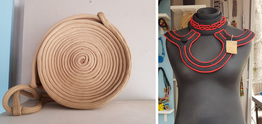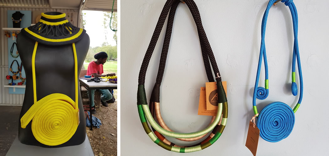 Growing up we always played with wire or beads. I worked for Pichulik for a while, learning skills with rope. Then I started doing my own designs, finding new ways of working with rope, and developed some innovative ways of making bags with rope too. Most of my work is based on colour, must be super colourful. Some of my statement pieces are based on the concept of the traditional Zulu beaded neck pieces, but instead of beads I use different coloured rope in intricate shapes for the designs.
