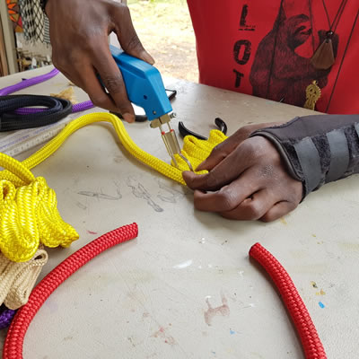 When you realise that you can do something new with the rope it’s fascinating. It takes concentration when you’re working with heat, if I press it too hard it’s going to burn the material, if it’s not hot enough it doesn’t work. The rope is the quality of ropes used for climbing and yachts, so it comes in lots of different colours which allows me to play around with designs without always having to wrap the rope in coloured thread.