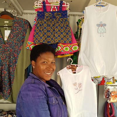 When I joined Spier Craft Market it was a huge learning curve. I started selling small pieces, neckpieces, ties for the first season. When I found out I was pregnant, I started making booties for my baby, and Sue suggested I sell them. I made five pairs and three sold in the first week. Then I added bibs, bows and face cloths. One day Sue came to my house to see the baby and saw some little dresses I’d made for her. She said I should try selling them. Now my best-sellers here are the dresses. That inspiration started growing and growing, and I’ve learned so much from Sue in terms of what sells, presentation, the business side.