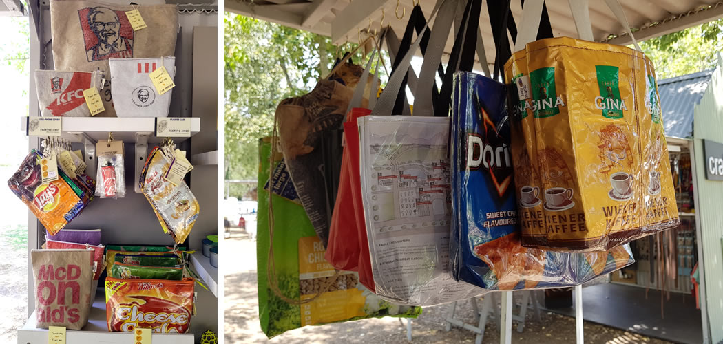 Ursula Korbe of Creative Lines up-cycles used packets made of foil and paper, (chips, chocolate, braai coal packets, coffee, take-away paper bags etc). With a creative burst of inspiration and little sewing machine wizardry, they become shopping bags, make-up bags, passport covers, cellphone covers and much more.